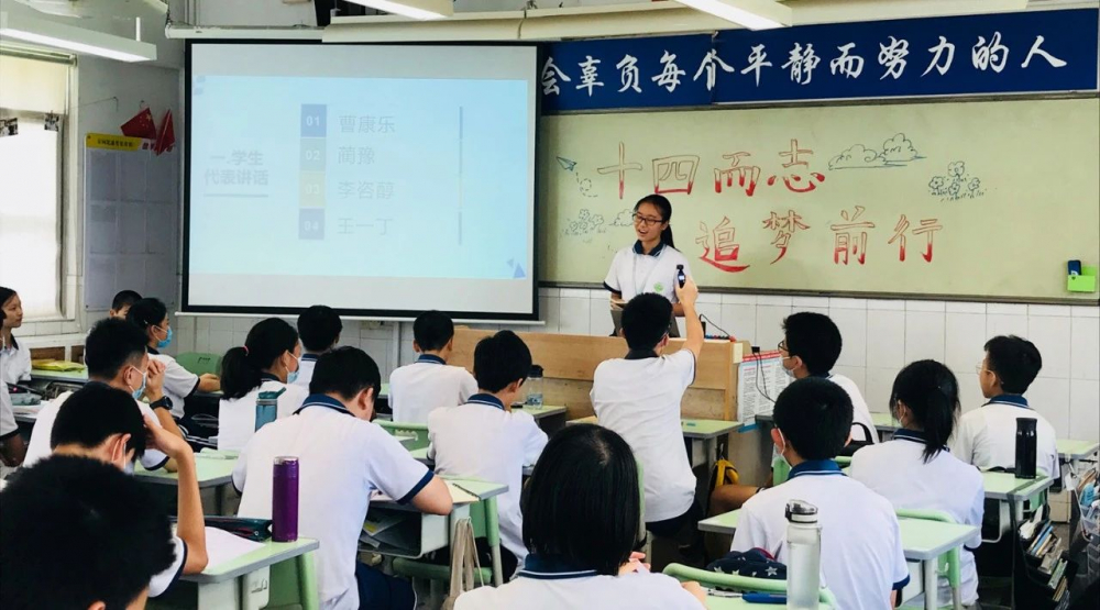 接着是各班喜闻乐见的故事分享环节。我班的六名学生代表和家长代表都准备了附中趣事或值得铭记的故事,班上像是开了脱口秀大会,笑声源源不断:我感谢全班同学对我班代表队参加学第一届辩论赛的支持;艾思清和钟睿同学分别讲述了学农期间女生宿舍和男生宿舍发生的“迷惑”事件;陈轩浩同学描述住宿生们住过的宿舍与认识的宿管;朱彦宇同学分享在赶晚自习途中的“不幸遭遇”;以及张元元同学总结了小学与初中的区别——发现了大家的不少变化与成长;家长代表讲话的主题是“十四岁,你想成为什么模样”,并祝愿我们都能成为自己想成为的人;班主任沈老师也表达了对同学们寄托的希望。