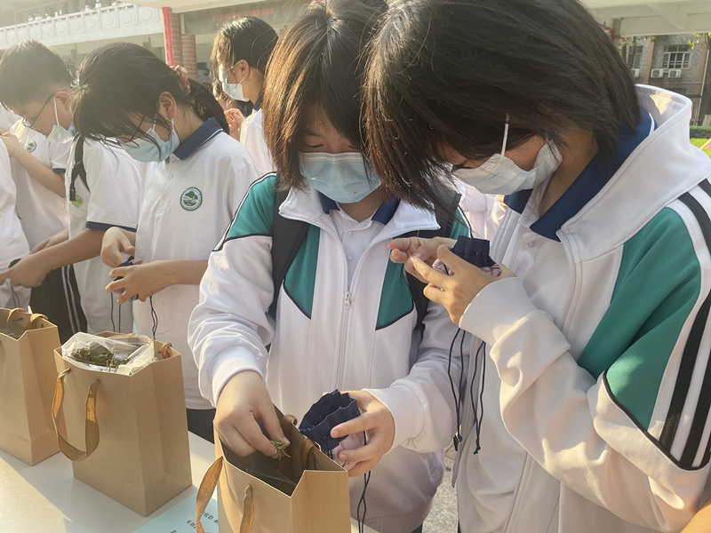周四下午还有“亲子香囊制作”的活动。当天,下课铃一响,同学们便从四面八方涌来,将现场围了个水泄不通。香囊的材料选取和搭配有所讲究,老师们分门别类地用文字一一说明,我们学习了香料的用途同时还体验了动手制作礼物的快乐。做完后亲手送给父母,沁人的花香扑面而来,解压又温馨,相信父母也会被这花香感染而心情爽快吧?