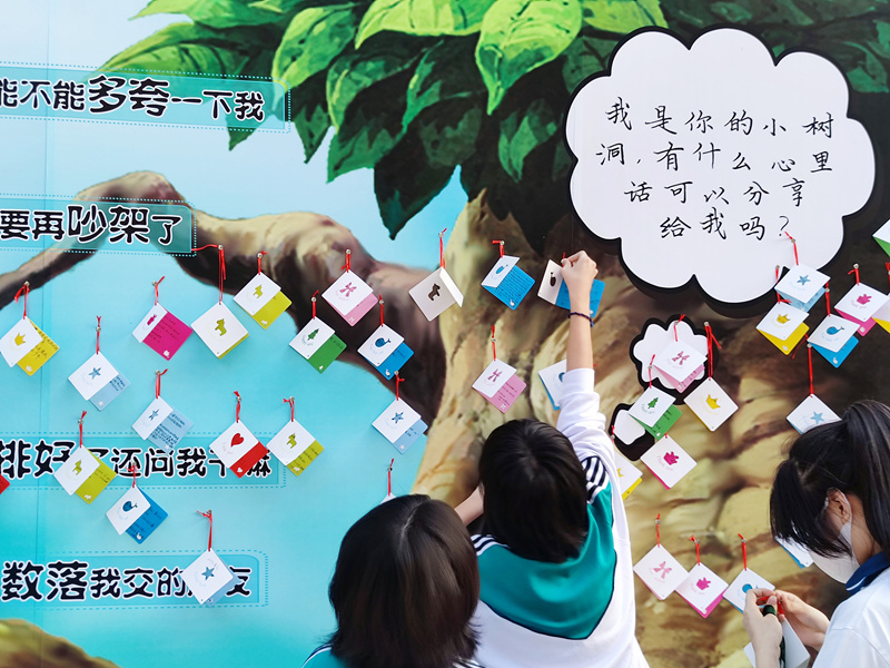 在周二和周四举办的树洞诉心声活动里,同学们可以在卡片上写下相对父母说的话,我们的真情实感很可能会经老师转给父母看到。这种类似于“匿名举报”的方式,听起来不太好,但对我们学生来说,是再好不过的倾诉方式了。我作为工作人员在现场帮忙为同学们的一张张卡片系红绳,把卡片挂上留言墙,既锻炼了动手能力,又感受到了实现自己价值的欣快感。当看到经过我在班宣传之后,许多同学前来支持并书写留言,心里暖暖的,备受感动。