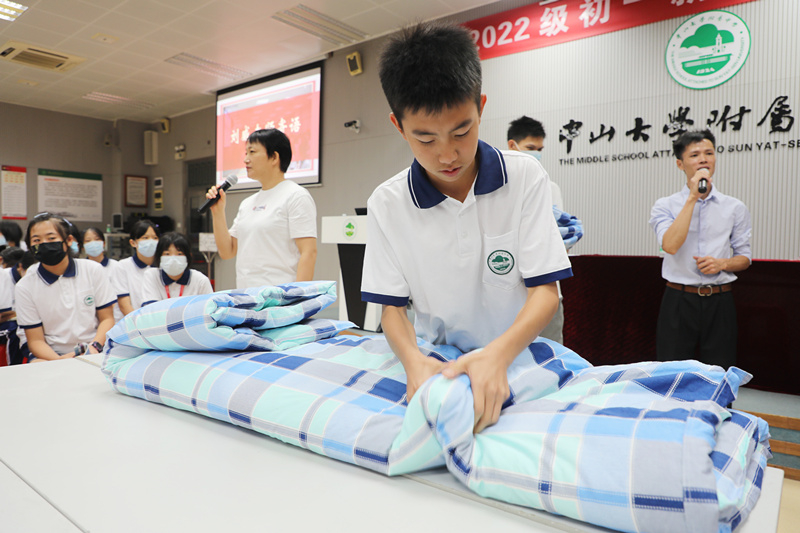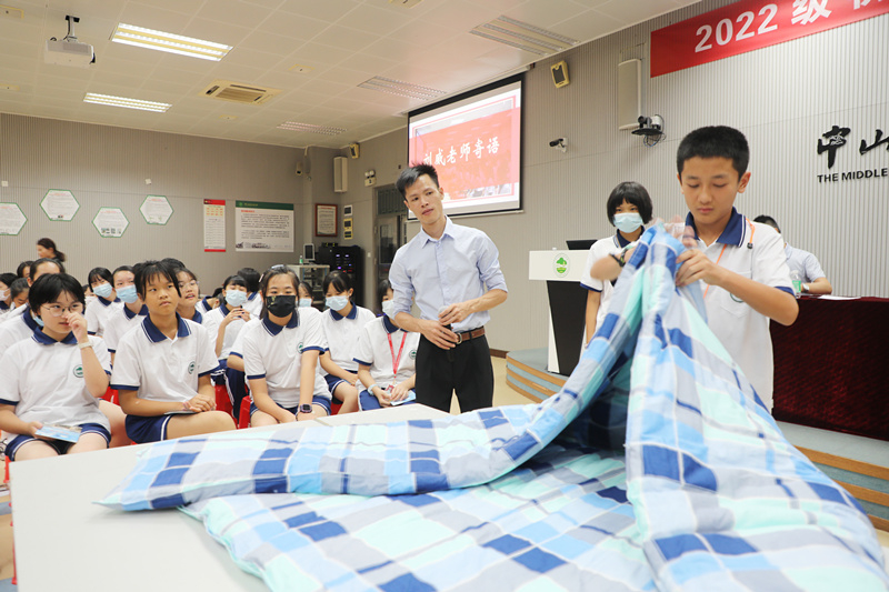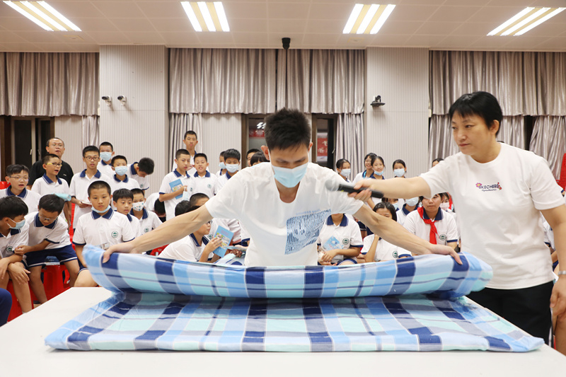 最后,两位生活老师亲自指导住宿新生叠被子的技巧和方法,会议在同学们积极的尝试中结束。