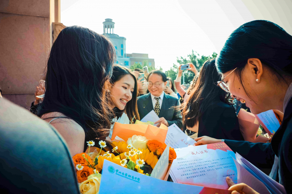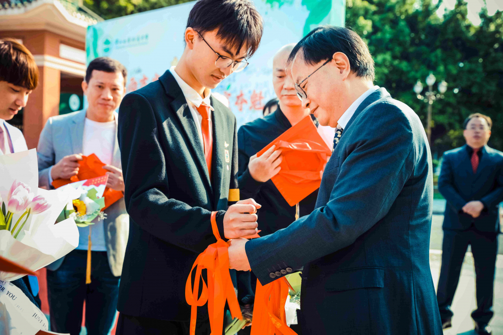 活动分为两部分,第一阶段是成人礼。到达中大牌坊广场后,每位同学在签名墙上签名并合照,等所有家长学生到齐后,便进行了第一项活动——跨越成人门。同学们结伴而行,少男穿着西装革履,风度翩翩,少女着裙落落大方,从容迈步,大家手挽手共同跨过象征自己成熟的“成人门”,并接受来自老师的祝福:向日葵鲜花、定制的中大附中版书签、《中国人民共和国宪法》以及成人证书。这一刻,我们已不是稚嫩懵懂的少年,而是能心怀天下,肩负重任的成人,这是我们成人的标志,是激励了我们音符!