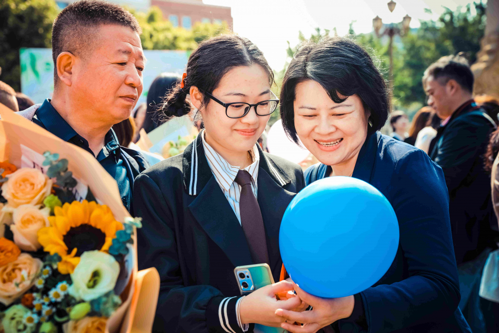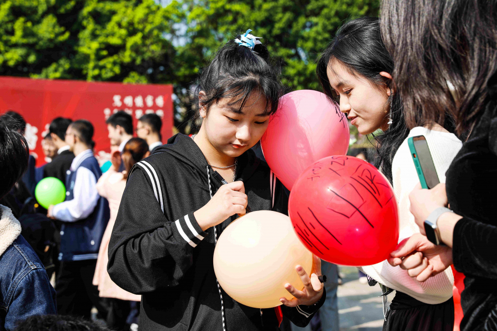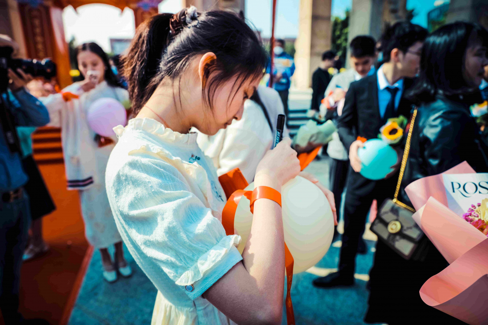 仪式结束前是“心怀梦想,放飞气球”环节。同学们在五彩斑斓的气球上,写下各自梦想祝福与自我鼓励的话语,在全场倒数五、四、三、二、一后,满怀少年们青春梦想的气球在空中升腾,朗朗晴空下,我们的梦想越飞越高。