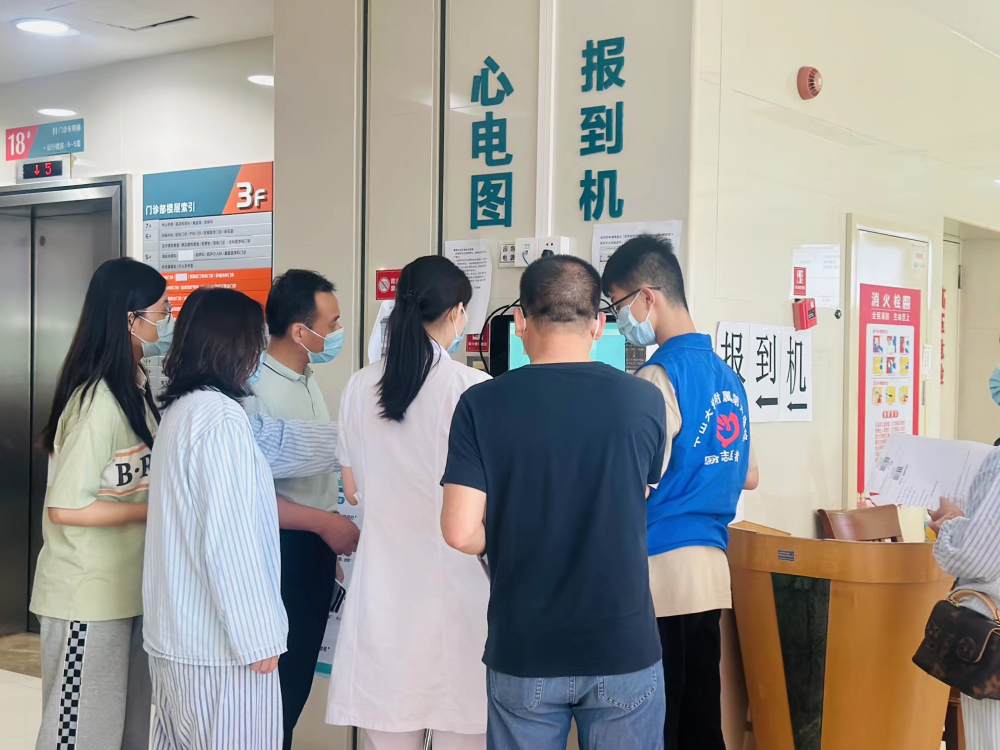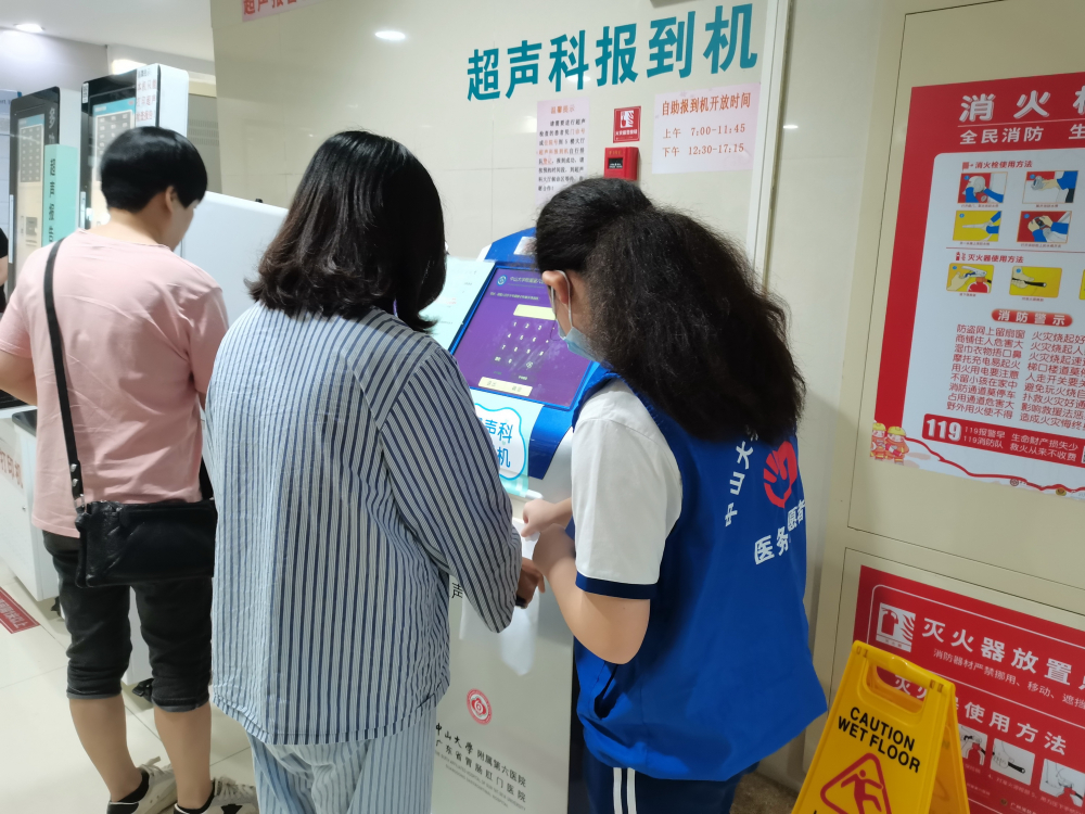 很快,我们被带到不同楼层不同的自助服务机器旁边进行导诊服务。我们的工作便是在一楼人流量最多的客户服务中心指引人们挂号、缴费、打印或是问诊。我们内心非常紧张,担心病人问的问题答不上来,很希望没人来问。但真的站到机器旁边,没人问询时自己又百无聊赖——指导老师要求我们导诊服务期间不能看手机、不能聊天,穿上蓝马甲代表了医院形象。