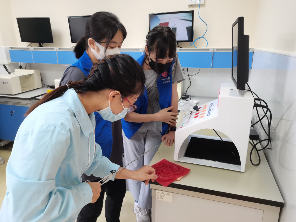 上午的最后一站,我们来到了医生们的培训中心。在这里,我们看到了平时医生们“考核”用的道具,看到了ICU里面是长什么样的,看到了真正正规的外科医生是怎样净手消毒的。最令我们记忆深刻的是自己亲身体验了医生做腹腔手术时的视角和操作。即使是最简单的“夹豆子”,对我们而言,一分钟夹10个似乎也是遥不可及的目标,更不用说在窥镜下手术缝针和打结了。部分同学还旁观了医生基本功的考核环节,彻底震撼了我们。一名能站在手术室里的医生,不知道要经历多少次考核,不知道要多少小时的技术训练,不知道缝多少次针、打多少个结……这些都让我们感触多多印象深刻:那些曾经在考核中努力、亦或是将要迎来考核的医生都绝不容易!