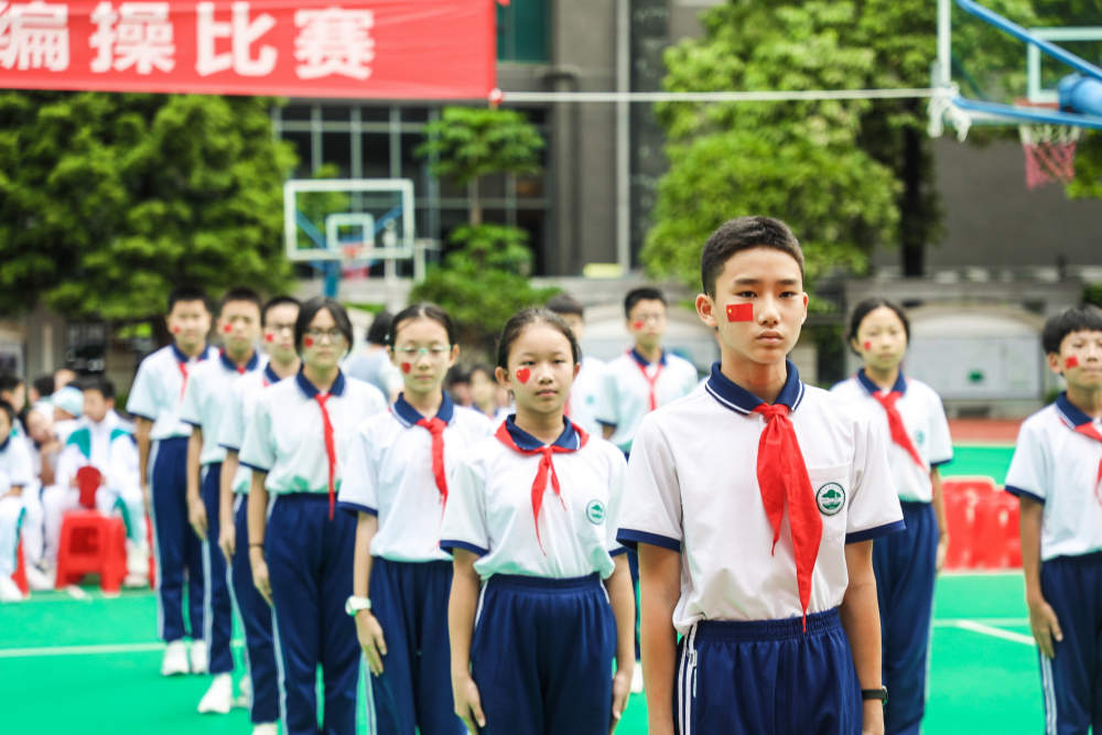 赛前,我们班进行了长达几个星期的“魔鬼式”训练。每次上体育课,梁老师就开始带领我们练操,班主任胡老师在一旁监督并为我们加油打气。每一个动作梁老师都要求我们做到最标准,每一次队形变换都要求我们做到最整齐,梁老师不厌其烦地一次又一次为我们展示和纠正动作,让我们能在比赛时动作更加规范。班里住宿女生也默默付出着,她们主动提出利用自己的课余时间操练。