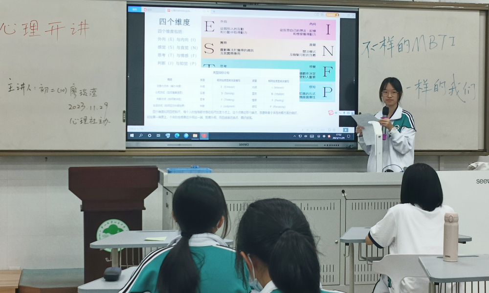 11月29日第9节课后,心理社主办的心理开讲于录播室顺利举行,主讲人为初二10班廖琰滢,主题是:不一样的MBTI,不一样的我们。