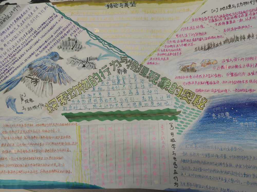各年级同学热情高涨,积极参与。本次活动共收到初一、初二两个年级43幅作品,参与人数达120人。作品内容非常丰富,有的把动物的行为研究分别从生物学科和物理学科角度进行探究,有的分别从历史学科、地理学科的角度来探讨城市的发展,有的分别从历史学科和语文学科的角度来图文并茂地介绍《世说新语》,其中最具匠心的是初二1班吴卓欣、郝泽瑄同学的手操报,分别从生物、物理、音乐、地理、历史和外语这六个学科来介绍长号这一乐器。评委们根据内容、可读性、观赏性等多方面进行比较、评定,最后评出一等奖7幅,二等奖10幅,三等奖13部,优秀奖13幅。