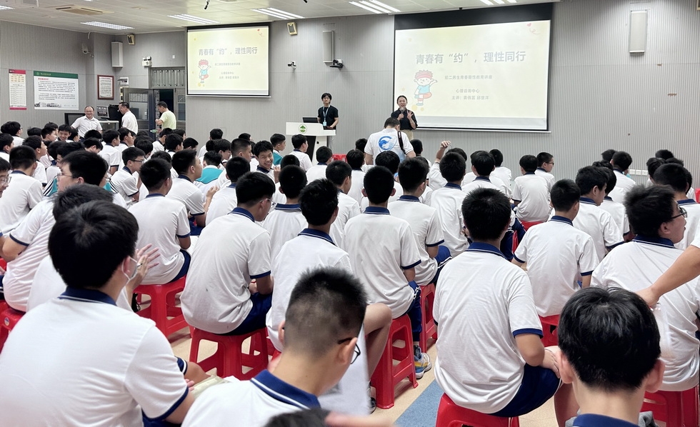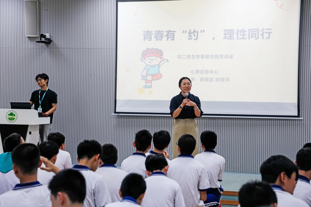 为了让学生进一步了解青春期各种生理及心理变化,强化学生自我保护意识,我校于2024年10月22日下午在讲学厅举行了初二级男生青春期性教育讲座:《青春有约,理性同行》,由我校国家二级心理咨询师袁俏芸老师和心理实习教师邱楚洋主讲,讲座分为三个部分内容:自慰现象、开黄腔、造黄谣的影响和如何合理地应对。