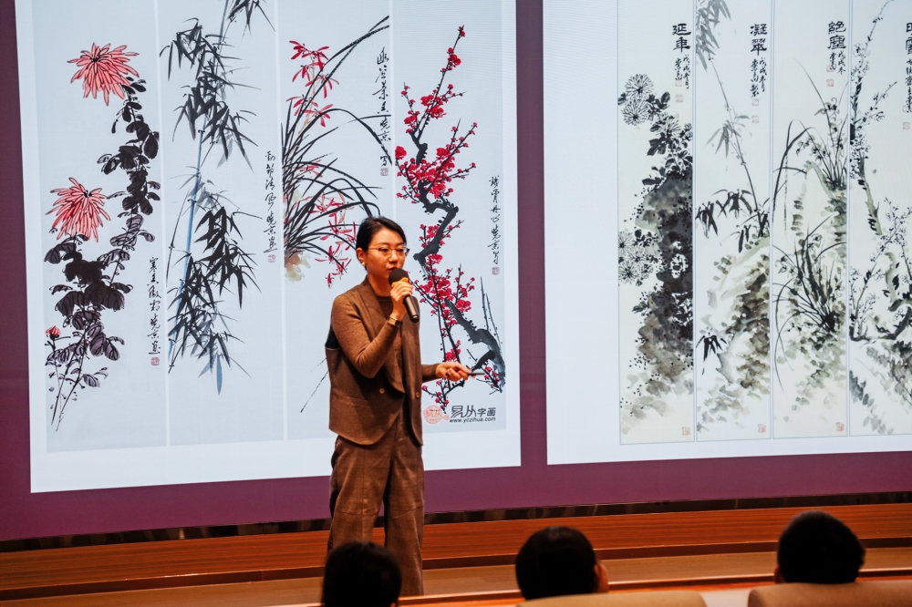 讲座中,王华菁博士还提到了创造力在艺术创作中的重要性。她以自己画梅兰竹菊的经历为例。由于传统梅兰竹菊形象离她的生活较远,她创造了一套新的梅兰竹菊形象——梅子、惠兰、内门竹、牡丹菊。这些新形象虽没有传统的淡雅,却更加俏皮可爱,深受同学们喜爱。此外,她还尝试将中国画与谐音梗结合,创作出了一系列有趣的作品,展现了艺术的无限可能。她提到,艺术来源于生活,只要我们细致地观察生活、用心感受生活,灵感就会自然而然地涌现出来。她鼓励同学们从身边的事物中寻找创作灵感,勇于表达自己的想法和感受。