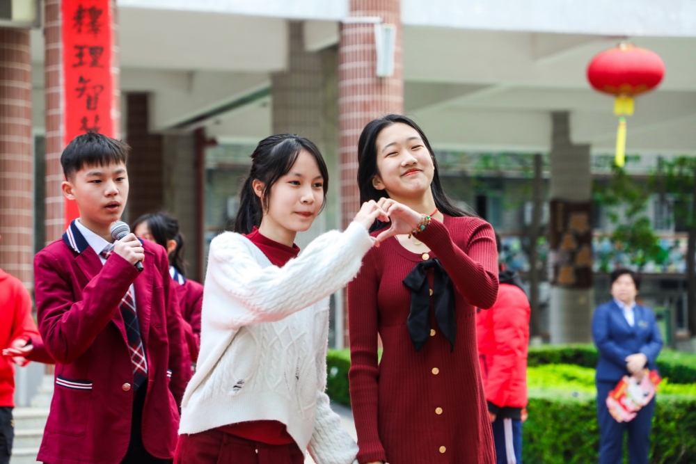 迎着初升的太阳缓缓升起,同学们迈着轻快的步伐走进校园。看!严钦熙校长带领老师们早早守在校园门口迎接全体师生新学期的到来,开启蛇年“巳巳如意”的新气象。两旁的男老师风度翩翩,女老师身穿汉服马面裙,喜气洋洋,秀韵典雅,一同给同学们送上新年糖果红包,寄托美好的祝福。