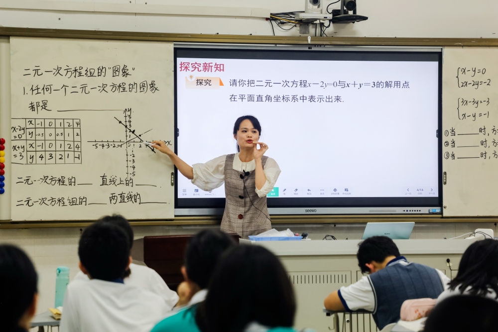 公开课由中山大学附属中学青年教师许丽平主讲。许老师以笛卡尔与公主的爱情故事导入,激发学生思考二元一次方程“图像”的模样。接着,借助几何画板动态演示,直观呈现二元一次方程图像的形成过程。课堂上,学生们踊跃参与小组讨论,通过绘制多个二元一次方程图像,自主归纳出“二元一次方程的图像是一条直线”以及“二元一次方程组的解对应两直线交点的横纵坐标”等重要结论。许老师还将数形结合的数学思想贯穿始终,体现了数学思想方法的渗透。课程最后,她布置了项目式作业,让学生画一组二元一次方程图像构造木棉花图案,呼应导入的心型曲线,落实德育教育目标,呼吁同学们顺应时代号召,努力学习,成为自己心中的英雄。