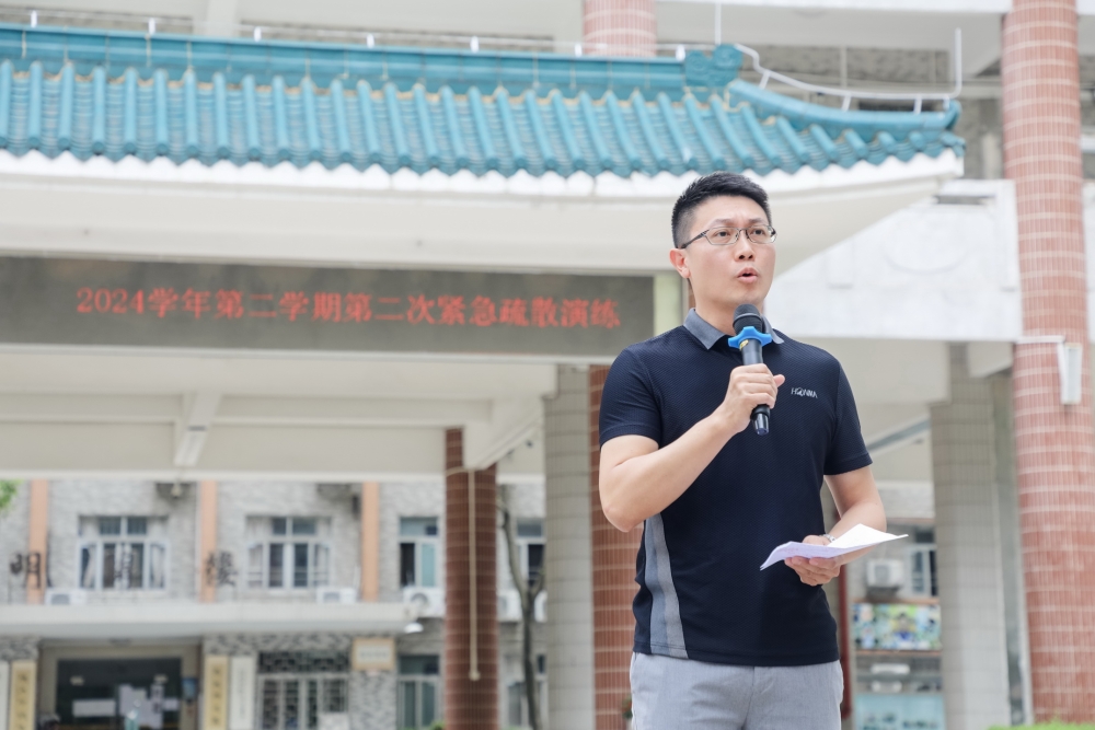 最后一位同学归队后,德育处副主任黄俊老师总结。他提到,此次演练师生撤离井然有序,紧跟指引,各楼梯口撤离时间均控制在三分钟内,较上次速度提升。尽管天气炎热,但大家的逃生速度和冷静态度值得肯定,希望未来能更快更稳应对紧急情况。