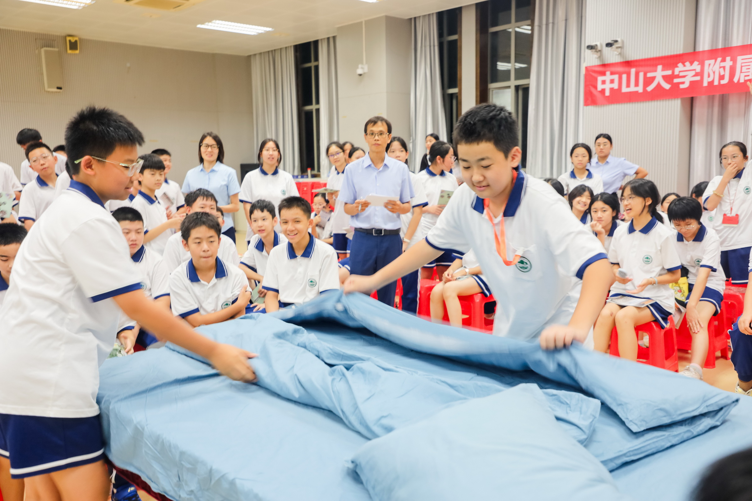 会议尾声的叠被子比赛增添了轻松氛围。张利霞老师现场示范,将被子叠得方方正正,随后五位同学上台竞技,现场气氛热烈。这场比赛不仅让大家掌握了快速叠被技巧,更增强了自理能力与团队协作意识。