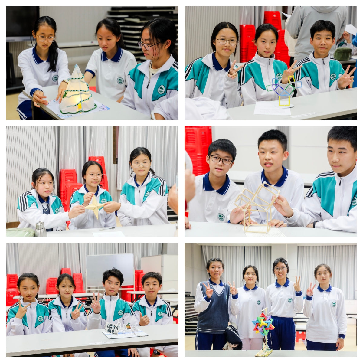 展评现场热闹非凡,各参赛小组的模型琳琅满目。部分作品复刻经典几何体:色彩斑斓的星极几何体由四面体穿插嵌套而成,旋转间尽显“点、线、面、体” 的复杂关系;纸带编织的镂空正方体,折痕精准对应几何参数,直观展现立体几何中面与面的关联。另有作品融合数学原理与生活灵感:勾股树模型以勾股定理为核心,用正方体、三棱柱泡沫逐层迭代搭建,“树枝” 面积严格遵循 a² + b² = c²;还有小组借木棍与三角形稳定性,搭建出兼具稳固性与张力的空间架构,体现数学的工程应用价值。