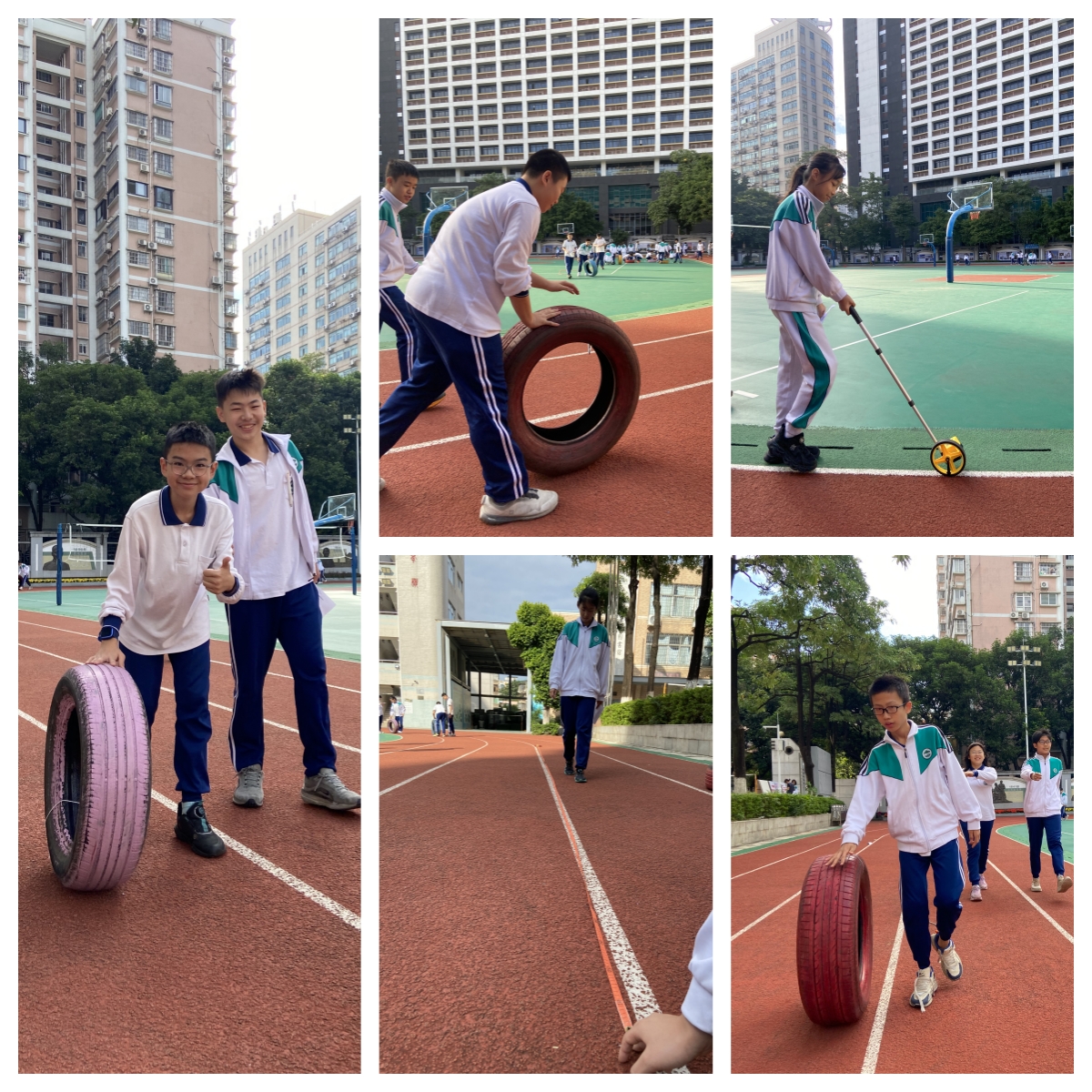 紧接着是实地测量环节。同学们分组领取轮胎、卷尺等工具,首先仔细测量出轮胎的周长。随后,各小组选择不同跑道,从起点开始推动轮胎沿直线匀速滚动。一人负责推动并保持方向,另一人专注计数并记录圈数。整个操场顿时化身为充满合作与探索精神的“露天实验室”。